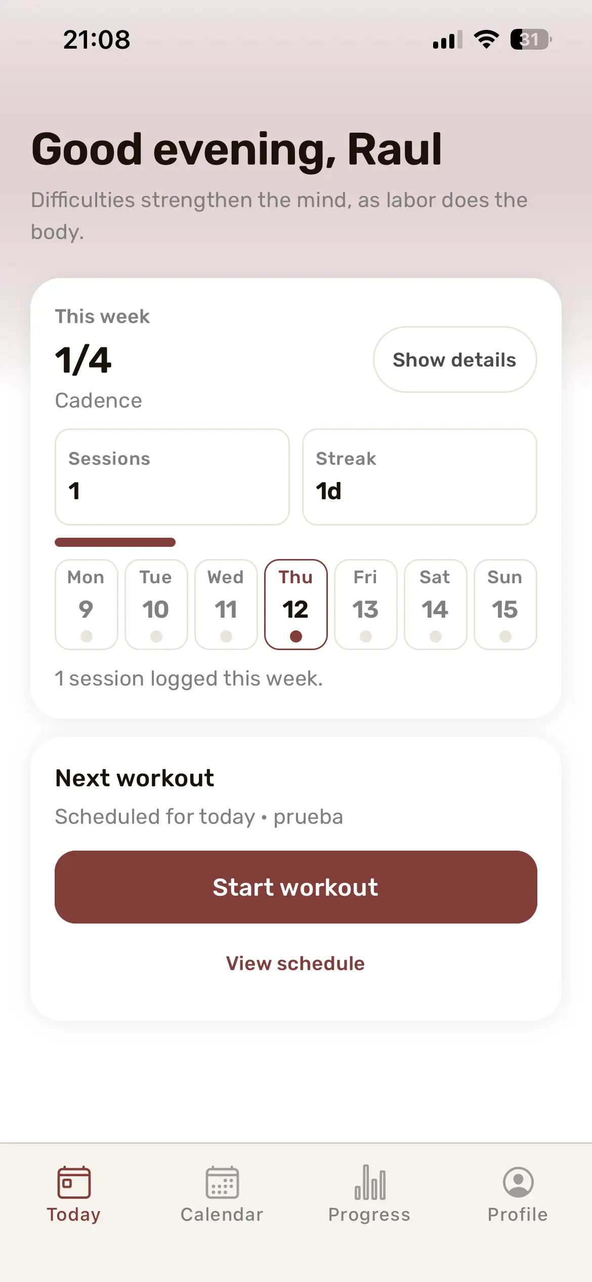Un tracker de entrenamiento construido alrededor de rutinas, programación semanal y comienzos rápidos.